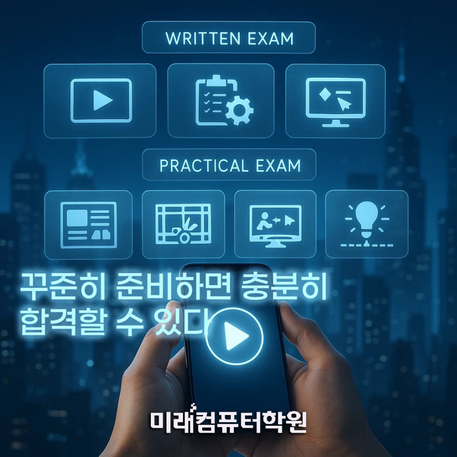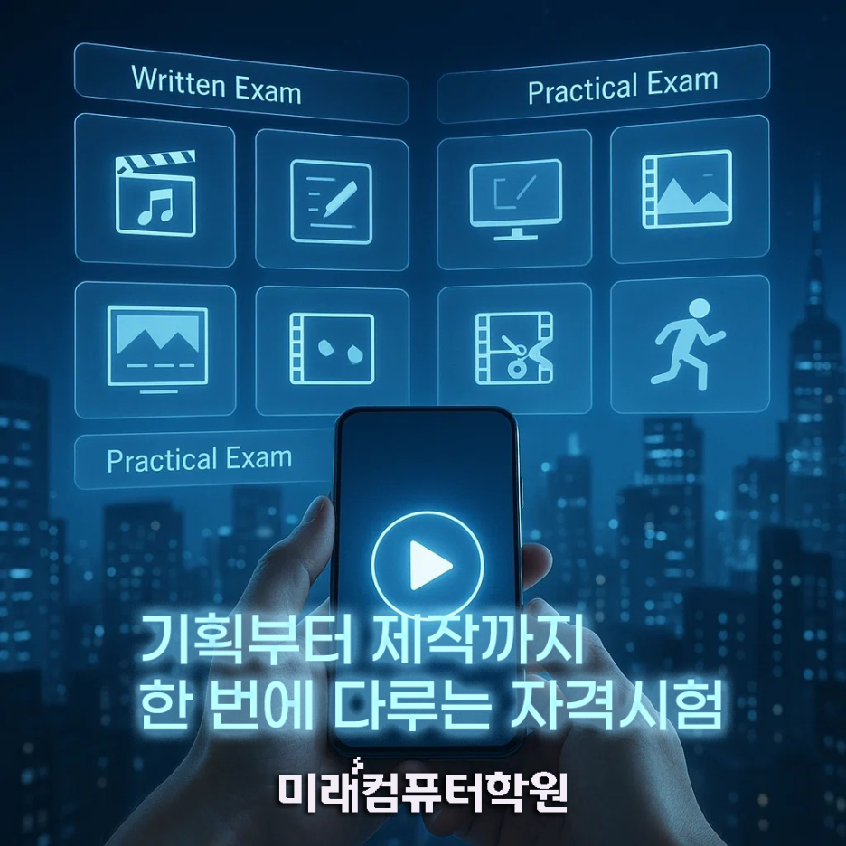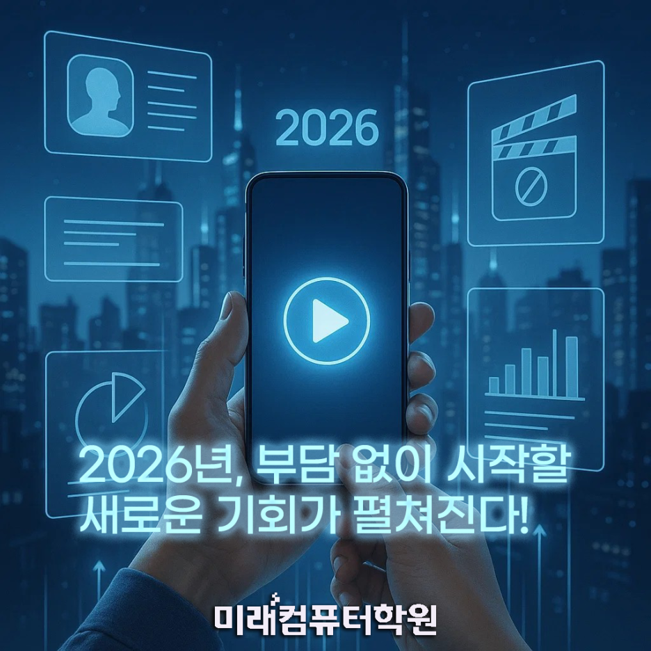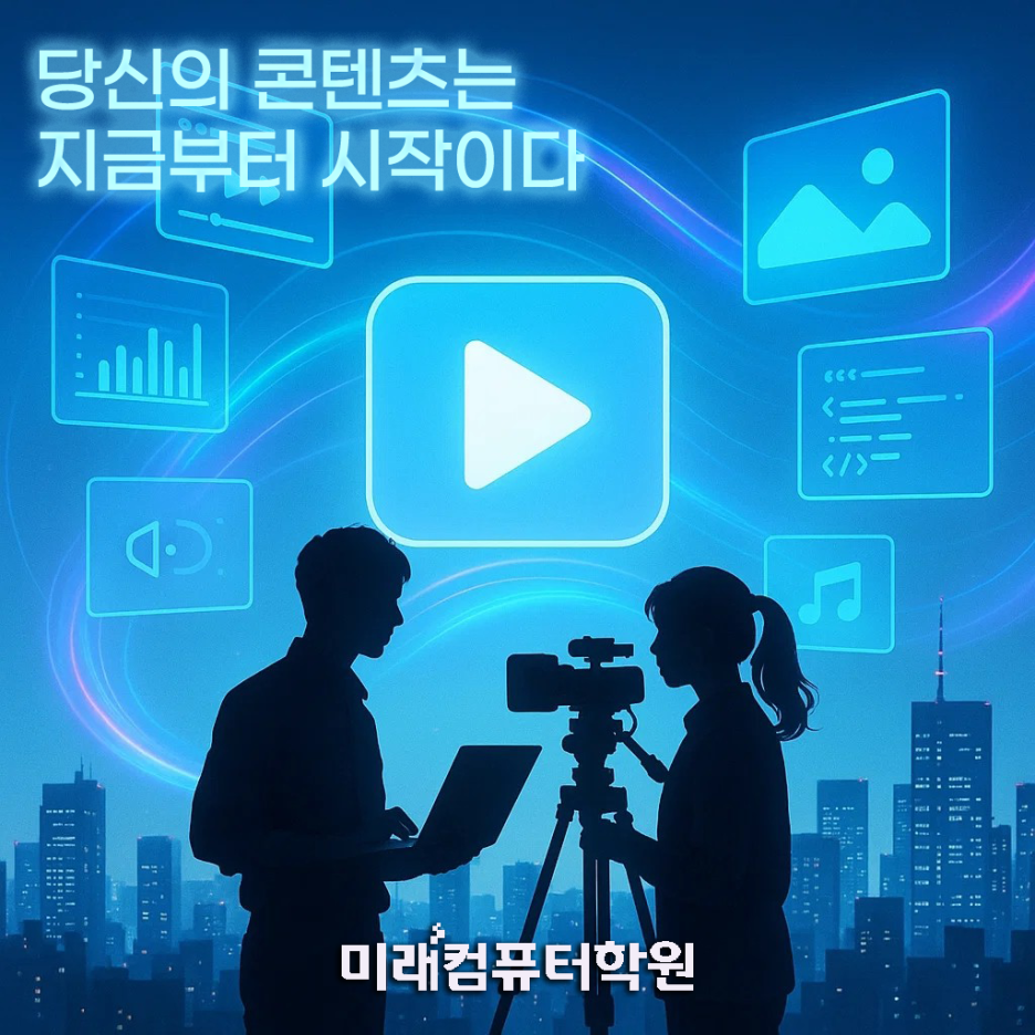 새로운 기술을 배우겠다는 마음은 늘 쉬운 선택이 아닙니다. 하지만 도전하는 순간부터 조금씩 세상이 다르게 보이기 시작하죠. 영상·디자인·콘텐츠 제작 분야는 특히 변화가 빠르지만, 그만큼 기회를 가장 많이 만들어주는 곳이기도 합니다. 미래컴퓨터학원은 그 길을 혼자 걷지 않도록 옆에서 함께 걸어가는 동반자가 되고 싶습니다. 작은 한 걸음이 더 큰 미래로 이어질 수 있다는 믿음으로, 여러분의 도전을 응원합니다. 이제 당신의 이야기가 콘텐츠가 되고, 그 콘텐츠가 새로운 미래를 여는 순간을 함께 만들어보세요.