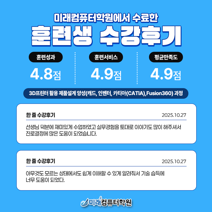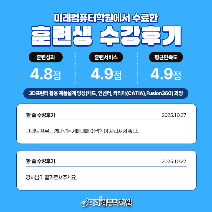 #미래컴퓨터학원 #부산미래컴퓨터학원 #부산국비지원 #부산국비지원학원 #국비지원학원 #부산컴퓨터학원 #내일배움카드 #국비지원과정 #직업훈련 #훈련생수강후기 #수강후기 #훈련만족도 #3D프린터 #3D프린팅 #제품설계 #제품설계과정 #3D모델링 #CAD #캐드 #오토캐드 #Inventor #인벤터 #CATIA #카티아 #Fusion360 #퓨전360 #기계설계 #전산응용기계제도 #설계취업 #설계직무 #취업준비 #취업상담 #부산취업 #부산교육 #실무교육 #실무중심교육