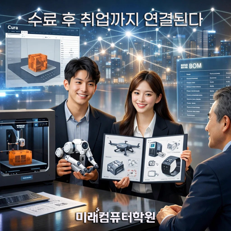 특히 3D모델링과 3D프린팅까지 가능한 인력은 현장 실무 투입이 빨라 기업 선호도가 높습니다.