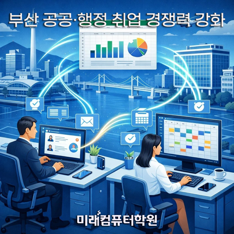 부산지역은 공공기관·행정·총무·대학조교·전산사무 분야 채용이 꾸준하며, 특히 컴활1급 보유자는 엑셀 데이터 처리와 문서 자동화 역량으로 우대받습니다. 사무직 취업에서 가장 활용도가 높은 자격증으로 경쟁력이 높습니다.