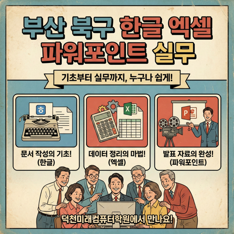 #부산북구컴퓨터학원 #덕천동컴퓨터학원 #부산북구한글엑셀 #덕천미래컴퓨터학원 #북구컴퓨터교육 #화명동컴퓨터학원 #구포컴퓨터학원 #만덕컴퓨터학원 #금곡동컴퓨터학원 #덕천역컴퓨터학원 #부산중장년교육 #중장년컴퓨터교육 #5060컴퓨터 #시니어컴퓨터 #컴퓨터기초 #왕초보컴퓨터 #한글기초 #엑셀기초 #파워포인트기초 #컴퓨터실무 #문서작성기초 #엑셀수식 #부모님컴퓨터 #컴퓨터기초부터차근차근 #실생활컴퓨터 #컴퓨터배우기 #주2회수업 #컴퓨터사무실무 #부산엑셀 #부산파워포인트
