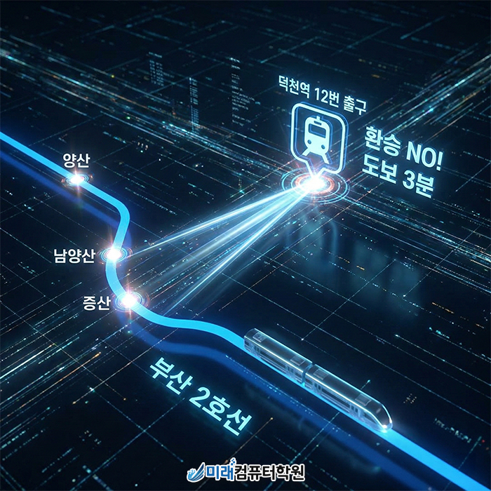 퇴근 후 지친 몸을 이끌고 학원으로 향하는 길이 멀고 험하다면 작심삼일이 되기 십상입니다. 덕천미래컴퓨터학원은 부산지하철 2호선과 3호선 환승역인 덕천역 12번 출구에서 도보 3분 거리에 위치해 있어 압도적인 접근성을 자랑합니다. 양산역, 남양산역, 증산역, 호포역 등 양산 지역에서 지하철2호선을 타면 환승할 필요없이 한 번에 빠르고 편안하게 도착할 수 있습니다. 지리적 이점이 뛰어나 퇴근 후 부담 없이 들를 수 있는 최고의 양산AI국비교육 기관입니다.