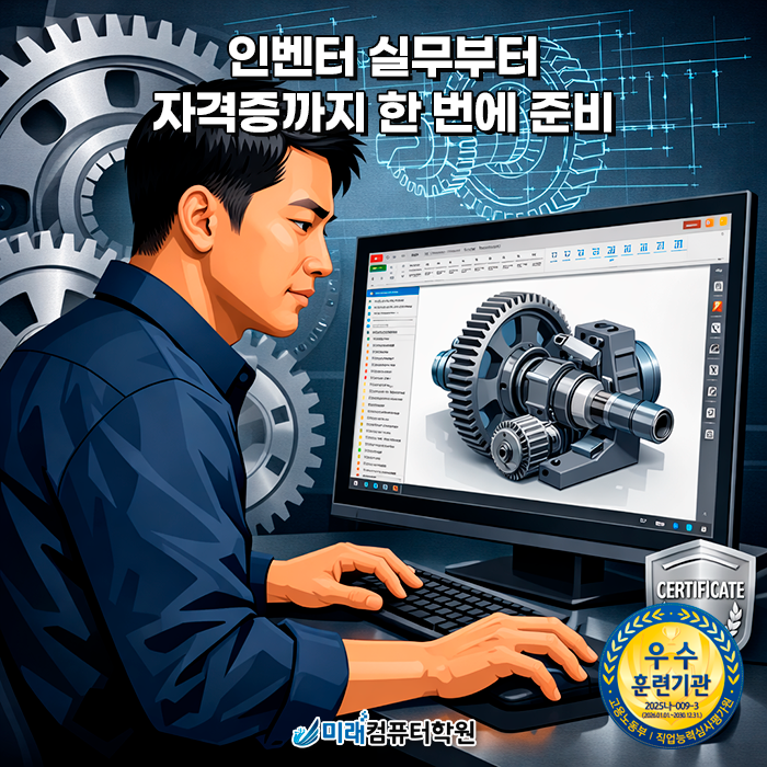 부산 인벤터 실무 과정, 기계캐드마스터 자격증 취득과 함께 설계직 취업을 현실로 만들어보세요.