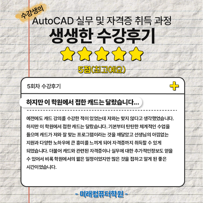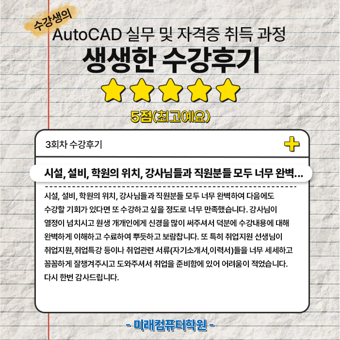 또한 AutoCAD 자격증 대비반을 운영하여, 실무 활용 능력과 자격증 취득을 동시에 잡을 수 있도록 돕고 있습니다.