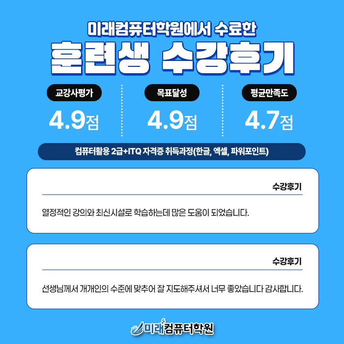 수강을 원하시거나, 교육에 대해 궁금하신 점이 있으시다면 미래컴퓨터학원에 문의해주시길 바랍니다.