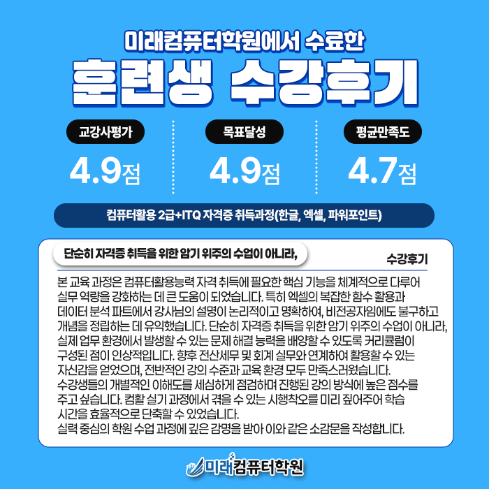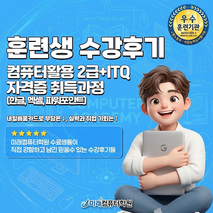 오늘은 부산 미래컴퓨터학원에서 컴퓨터활용능력 2급과 ITQ(한글, 엑셀, 파워포인트) 과정을 수료한