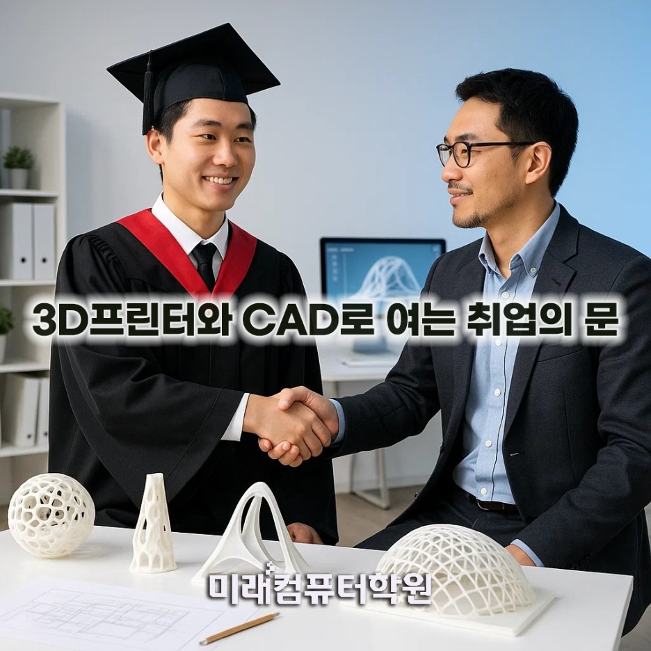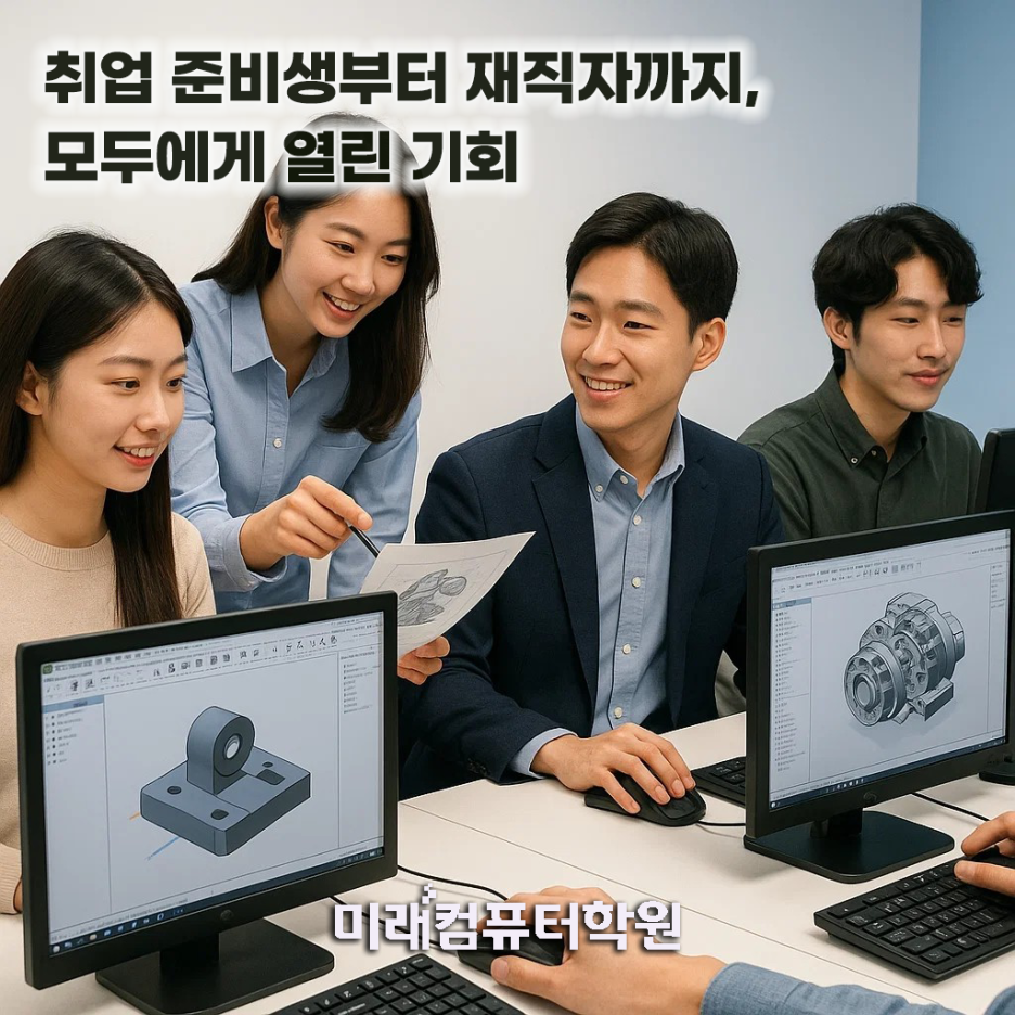 수료 후에는 캐드원, 기계설계원, 제품디자이너 등 다양한 직종에서 활동할 수 있습니다. 특히 제조·설계 산업에서 CAD·CATIA·Fusion360 실무 능력과 3D프린터 운용 기술은 취업 경쟁력을 크게 높여줍니다.