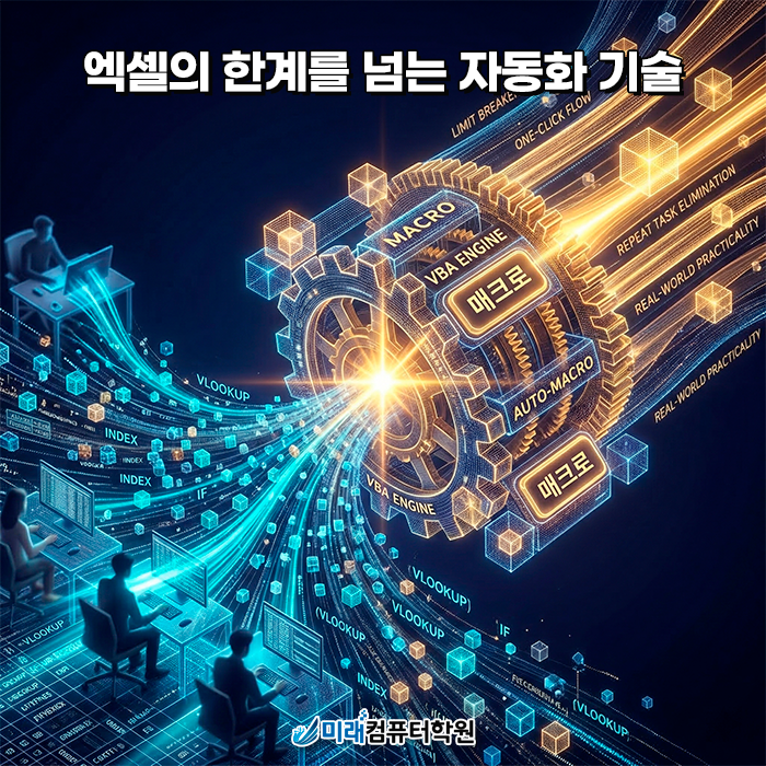프로그램 자동화 설계법을 깊이 있게 다룹니다. 특히 1급 과정의 핵심인 VBA(Visual Basic for Applications) 프로그램과 매크로 활용법을 익히게 됩니다.