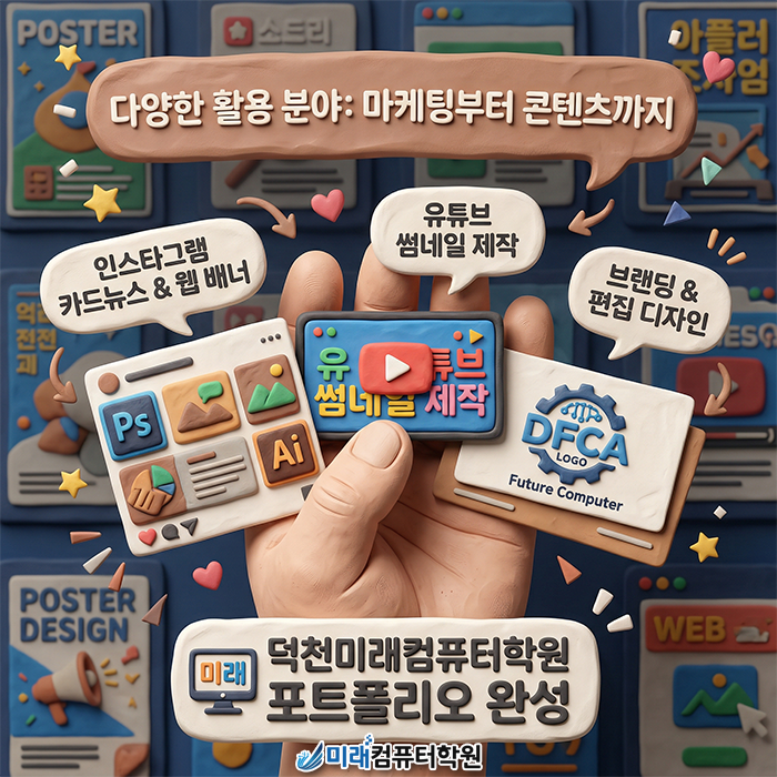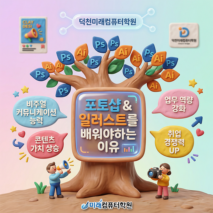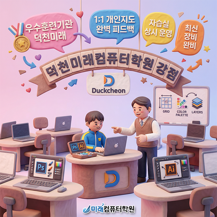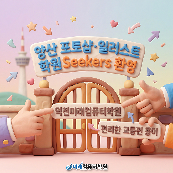 양산 포토샵·일러스트 학원을 찾으시는 여러분, 이제 더 멀리 고민하지 마세요. 덕천미래컴퓨터학원에서 여러분의 잠재된 크리에이티브를 깨워보시기 바랍니다!
