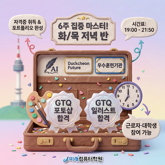 양산에서 지하철로 편리하게 연결되는 덕천역 인근의 덕천미래컴퓨터학원에서는 주간에 시간을 내기 어려운 직장인, 대학생, 취업 준비생들을 위해 저녁 반을 운영하고 있습니다. 양산 포토샵·일러스트 학원을 검색하며 커리큘럼과 시간표 사이에서 갈등하던 분들에게 화요일과 목요일 저녁 시간을 활용한 이 과정은 삶의 활력소이자 강력한 무기가 될 것입니다. 단기간에 기초부터 실무 포트폴리오까지 완성할 수 있는 효율적인 학습 시스템을 경험해 보세요.