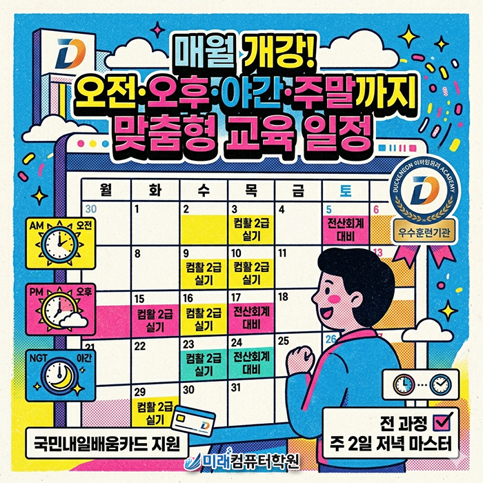 덕천미래컴퓨터학원은 여러분의 상황에 맞춰 오전, 오후, 야간, 주말반을 매월 상시 개강합니다. 국민내일배움카드를 활용하면 비용 부담도 대폭 줄어듭니다.