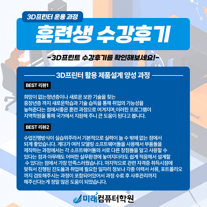 오늘은 많은 분들이 관심을 가지는 3D프린터 활용 제품설계 양성 과정의 실제 훈련생 수강후기를 소개합니다.