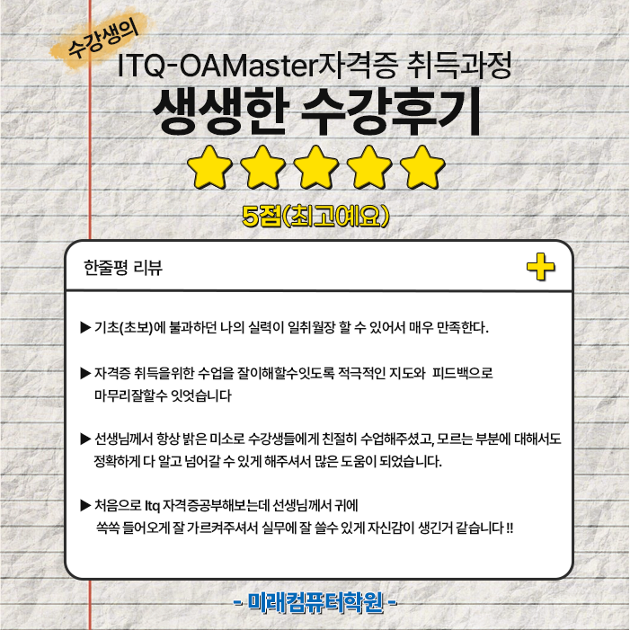 미래컴퓨터학원 ITQ-OAMaster 과정은 “자격증 합격” + “실무 자신감” 두 마리 토끼를 잡을 수 있는 커리큘럼입니다.
