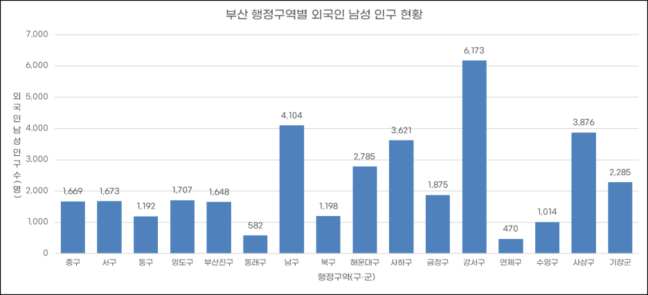 부산 외국인 남성 인구가 가장 많은 지역은 강서구(6,173명), 사상구(3,876명), 남구(4,104명), 해운대구(2,785명)